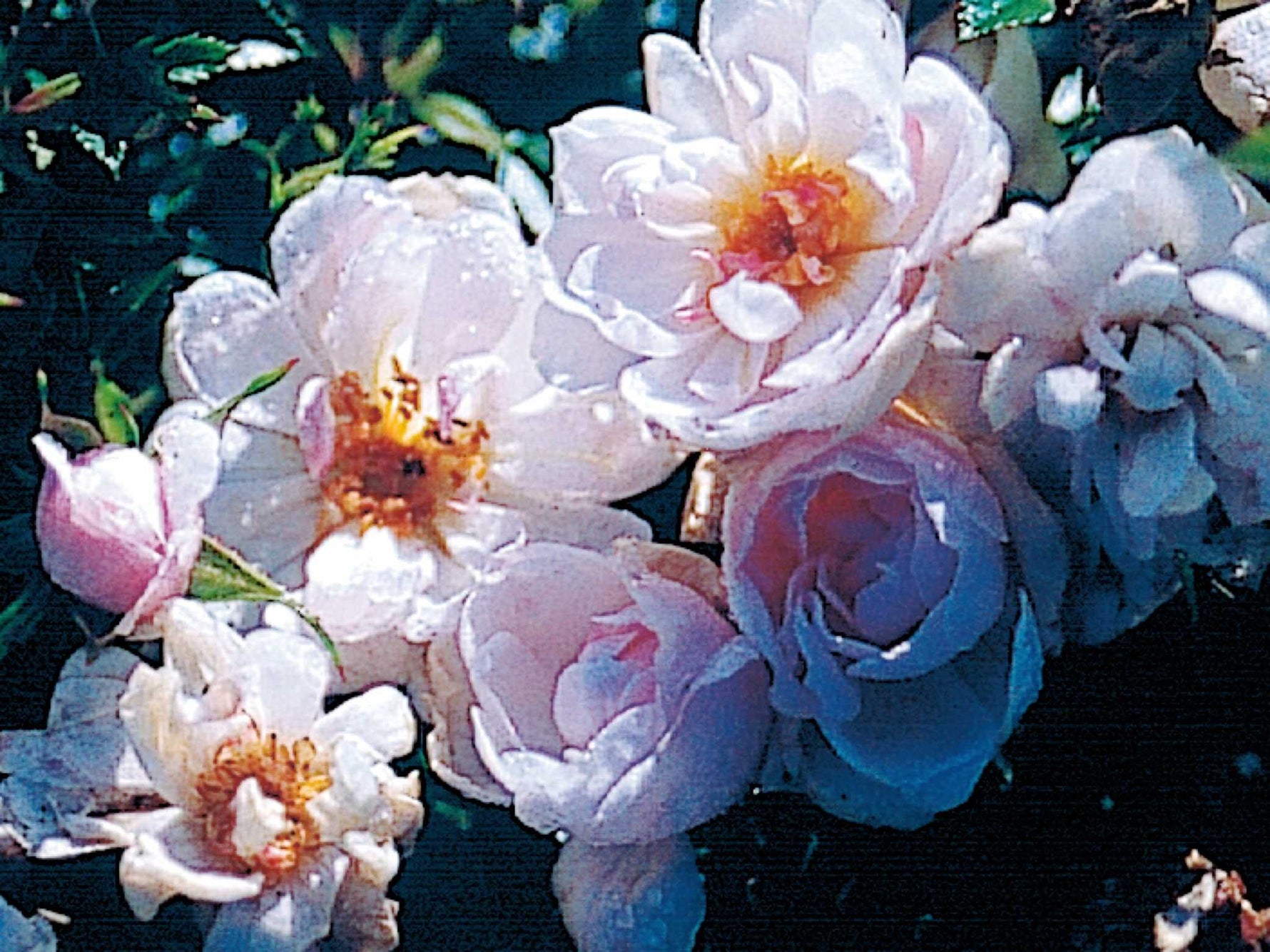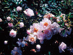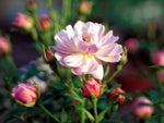 Die kleinen leicht gefüllten Blüten in weiß-rosé blühen in Dolden. Buschiger zierlicher Wuchs bis 40 cm Höhe. Robuste Bodendeckerrose. Für Kübel und Steingarten geeignet, insektenfreundlich